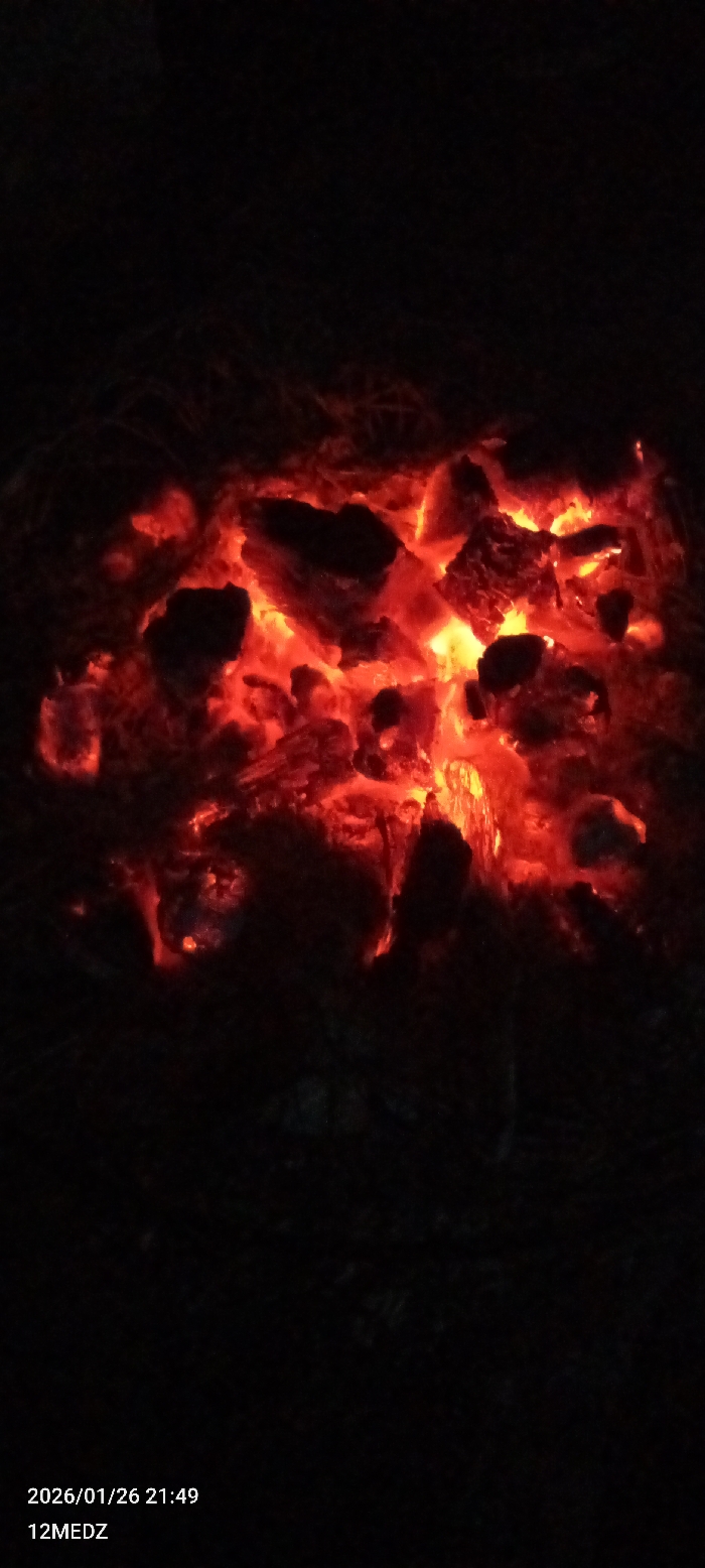 A close-up shot captures glowing embers and hot coals amidst darkness. The intense red-orange hues illuminate the fragmented pieces of burning material, creating a mesmerizing display of heat and light. The surrounding area is enveloped in shadow, emphasizing the fiery core. The bottom of the image shows the date 2026/01/26 and the code 12MEDZ.