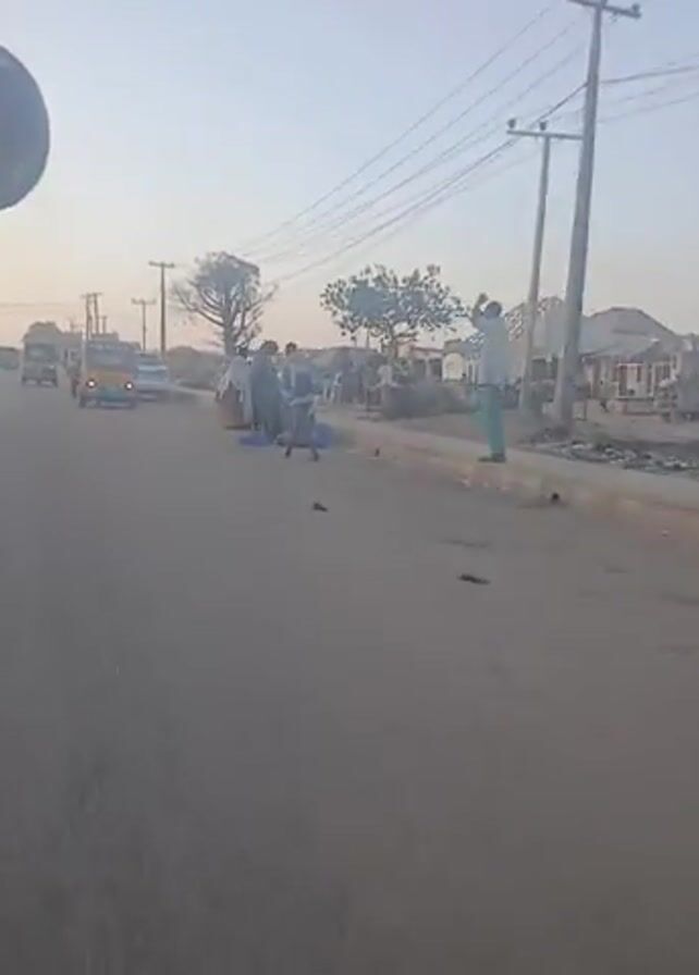 The video is taken from a moving vehicle, likely a tuk-tuk, traveling along a paved road in what appears to be a developing country. The sky is light, indicating it is either early morning or late afternoon. Along the roadside, there are people standing and waiting. Some have large bags or bundles, suggesting they might be vendors or travelers. A number of vehicles, including cars, other tuk-tuks, and a small truck, are visible on the road. Power lines run overhead, and there is a large billboard on the right side of the road. Buildings, some under construction, are visible in the background. The overall impression is of a busy, developing area with a mix of transportation and commercial activity.