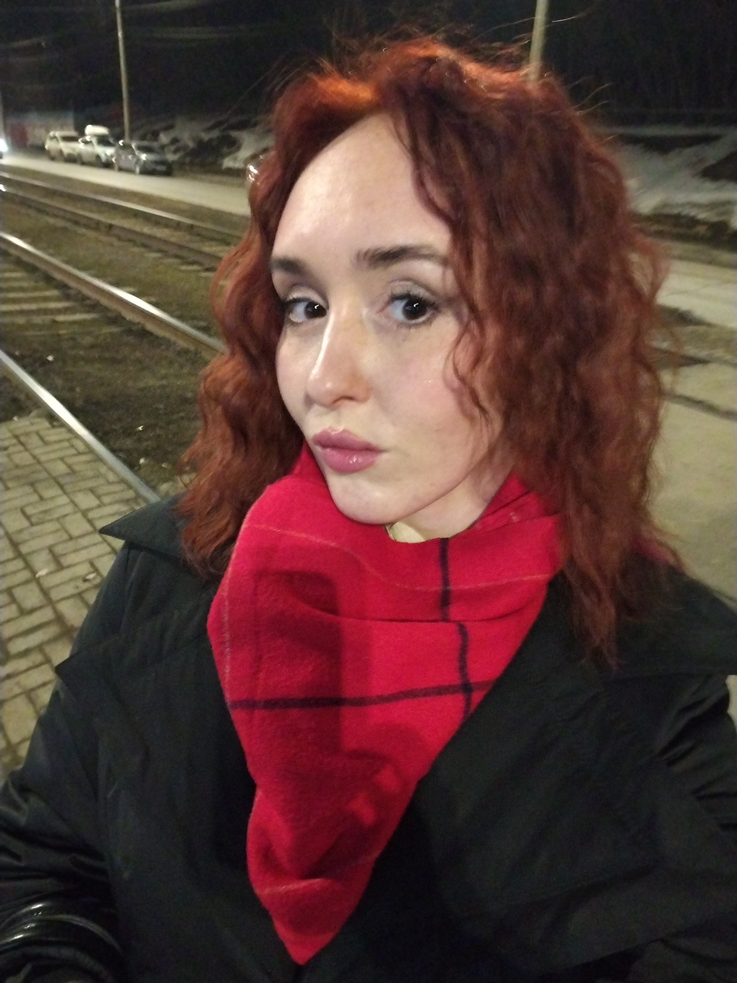 The image displays a nighttime scene in Izhevsk, Russia, featuring a single female individual positioned in the foreground, appearing to capture a self-portrait. The subject has long, wavy, reddish-brown hair, is wearing a dark-colored jacket, and a red scarf with black plaid-like lines around her neck. She is looking directly at the camera with her lips slightly puckered. In the background, an urban environment is visible under artificial illumination. To the left of the subject, a paved area, likely a sidewalk or platform, constructed from light-colored bricks, runs parallel to two sets of tram tracks. Beyond the tracks, a road with several parked or moving vehicles, predominantly light-colored cars, is discernible. The distant background shows areas of bare ground and patches of snow. Vertical poles, consistent with streetlights or tram power lines, extend upwards. The sky is dark, indicating night conditions. No other persons are visible in the frame.