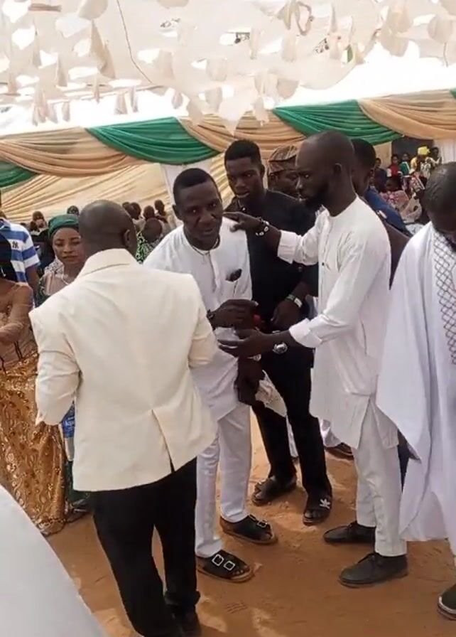 wedding celebration. Several men, mostly wearing white outfits, are gathered in a semi-circle, moving slightly to music. A bride in a traditional white wedding gown with a long veil walks past them. Several women dressed in various gold and green outfits follow the bride. The event is under a canopy decorated with white fabric pieces hanging down. There are some building structures visible in the background. The ground appears to be sandy.