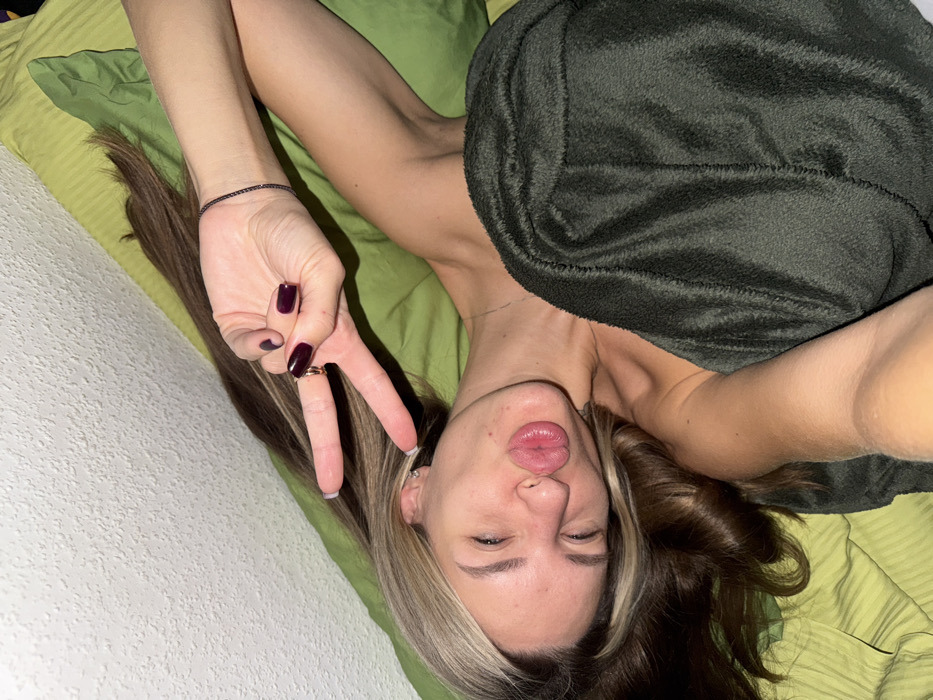 A young adult female is depicted in a close-up, angled indoor photograph. She lies on light green bedding, partially covered by a dark green, possibly fleece, blanket. Her hair is long, a mix of blonde and brown. She is looking towards the camera, her eyes partially closed, with her lips puckered into a "kissing" expression. Her left hand is raised, forming a "peace sign" gesture with two fingers extended. The fingernails on this hand are painted a dark, possibly burgundy, color, and a gold-colored ring is visible on her left ring finger. A thin, dark bracelet or chain adorns her right wrist. The background features a textured white wall. The scene is located indoors, within a residential setting in Berlin, Germany.