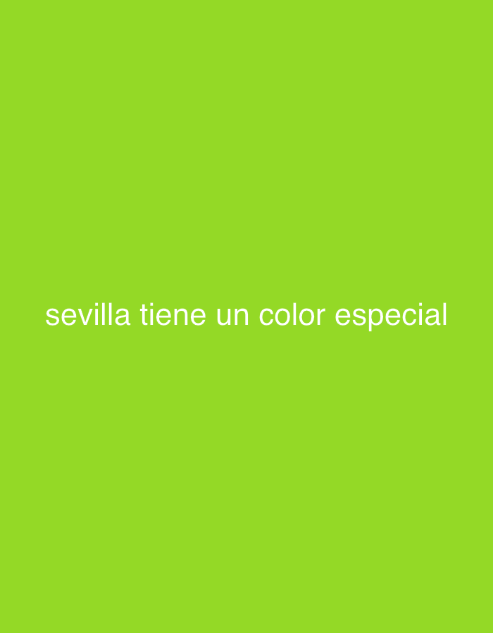 A solid, bright green background fills the frame. Centered horizontally and vertically is the text "sevilla tiene un color especial" in white sans-serif font. The text translates to "Seville has a special color." The color and text dominate the visual content.