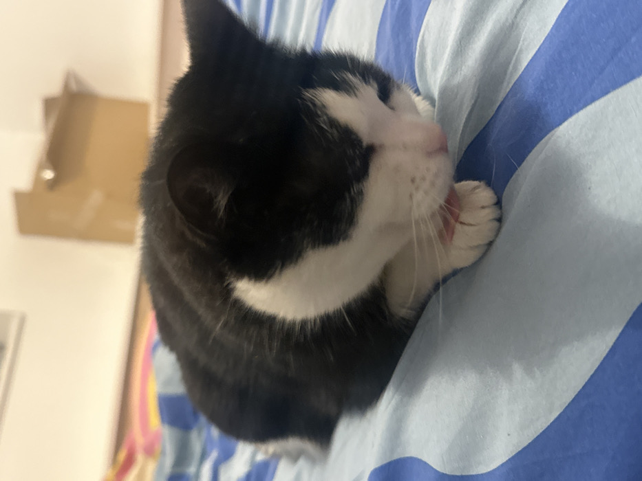 - "A black and white cat is captured mid-groom, its pink tongue visible as it licks its paw" by FM-sKHBD2, licensed under CC BY 4.0