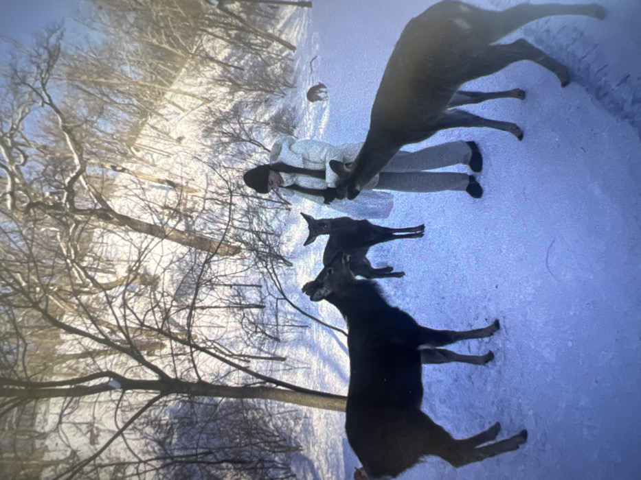 The image displays an outdoor winter scene, described as being in the city of Jos, Nigeria. The ground is uniformly covered in a thick layer of white snow, with numerous bare deciduous trees filling the background and midground, extending up a gentle slope under a bright sky. A single individual, appearing female, is centrally positioned, dressed in a black beanie, white puffer jacket, white scarf, light grey pants, and black slip-on shoes. She holds a white translucent object, possibly a bag or container, from which she is feeding or offering items to several dark-furred deer. Three deer are in the foreground, closely surrounding the person: one large deer is on the far left facing right, a smaller deer is directly behind the person, and another large deer is on the right with its head lowered towards the person's hands. A fourth deer is visible further up the snowy slope in the background. The interaction shows the person actively engaging with the deer, which appear accustomed to human presence and are gathering for food.