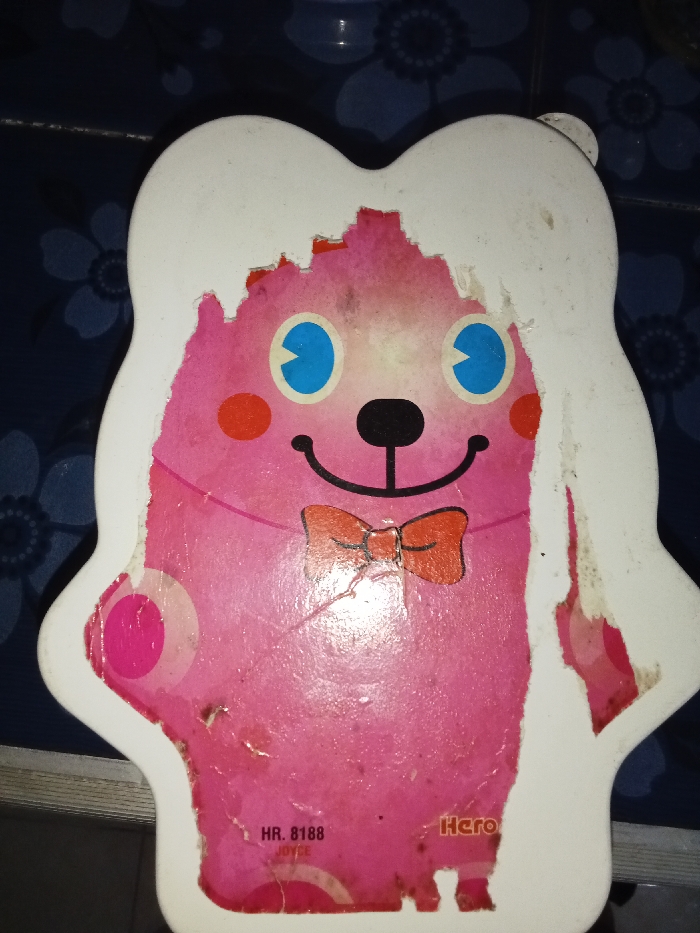 A flat, stylized, head-shaped decorative panel or toy is depicted in a top-down, slightly angled close-up. The panel primarily features a vibrant pink surface forming the face of a character, with large blue and black circular eyes, small red circular cheeks, a small black nose, and a black curved line forming a smile. An orange bow tie is positioned below the smile. This pink character is partially framed by a white, irregularly shaped outer layer, which shows extensive damage, peeling, and chipping along its edges, revealing the pink layer underneath. The visible surfaces of both the pink character and the white frame exhibit numerous scuffs, scratches, and dark smudges, indicative of wear. Faint, lighter pink circular patterns are present on the main pink body. In the lower left quadrant of the pink surface, text reads 'HR. 8188' and 'JOYCE' (partially obscured). To the right, 'Hero' is partially visible. The object rests on a dark blue surface adorned with a repeating pattern of lighter blue/grey floral or geometric motifs, consistent with a tiled floor or patterned fabric. A dark horizontal line is visible across the bottom of the background. The scene is located in Inxuba Yethemba Local Municipality, South Africa.