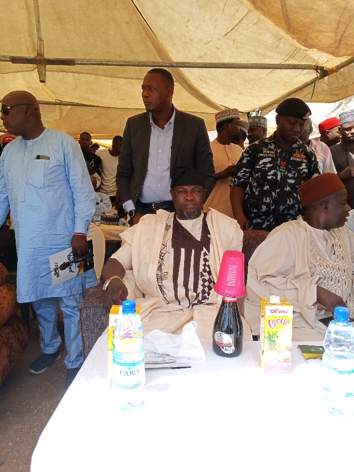 group of men seated at a table under a white tent. The men are all dressed in traditional clothing, and some are wearing hats. There is a bottle of water, a bottle of juice, and a bottle of wine on the table, along with a pink plastic cup. Two of the men appear to be speaking to one another. The scene is taking place in the town of Zum, in the state of Borno, Nigeria, at the coordinates provided. The environment is dry and dusty with little vegetation. The tent is propped up on metal poles, with the white fabric stretched taut.
