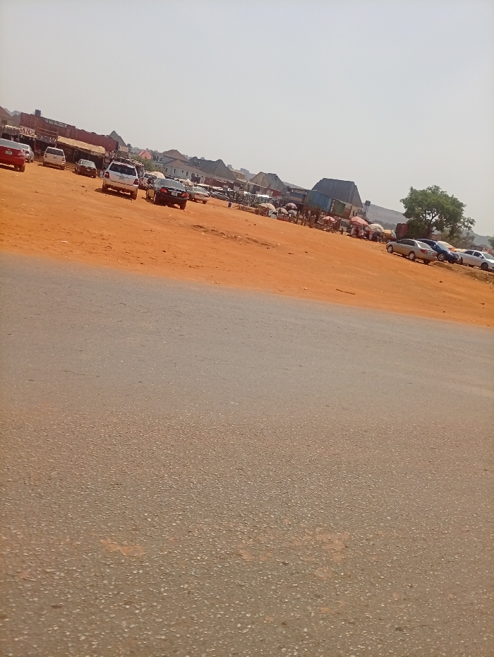 The image displays an expansive, open-air commercial or market area within Abuja, Nigeria, viewed from a slightly elevated vantage point