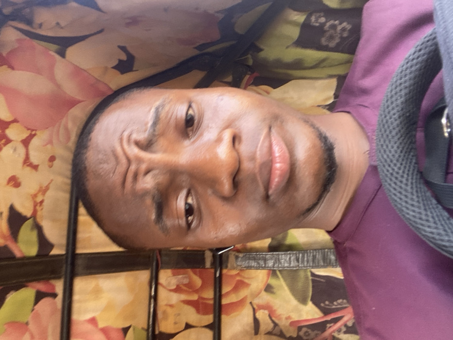 The scene is located in Katcha, Nigeria. A young adult male occupies the foreground, centered in the frame. He has dark skin, short dark hair, and dark eyes. His forehead exhibits prominent horizontal wrinkles and a vertical furrow between the eyebrows, contributing to a slightly furrowed, neutral to contemplative expression. He has minimal dark facial hair on his chin. He is wearing a plain, long-sleeved, collared garment of a dark reddish-purple color. Behind him, a vibrantly patterned fabric, possibly upholstery or a curtain, displays large floral motifs in shades of cream, pink, orange, green, and brown against a darker background. Dark, slender metal bars are visible to the left and partially to the right of his head, suggesting an enclosed space. In the lower foreground, a dark, mesh-textured object, possibly a bag strap or part of a vehicle interior, is partially visible. The individual is looking directly forward towards the camera.