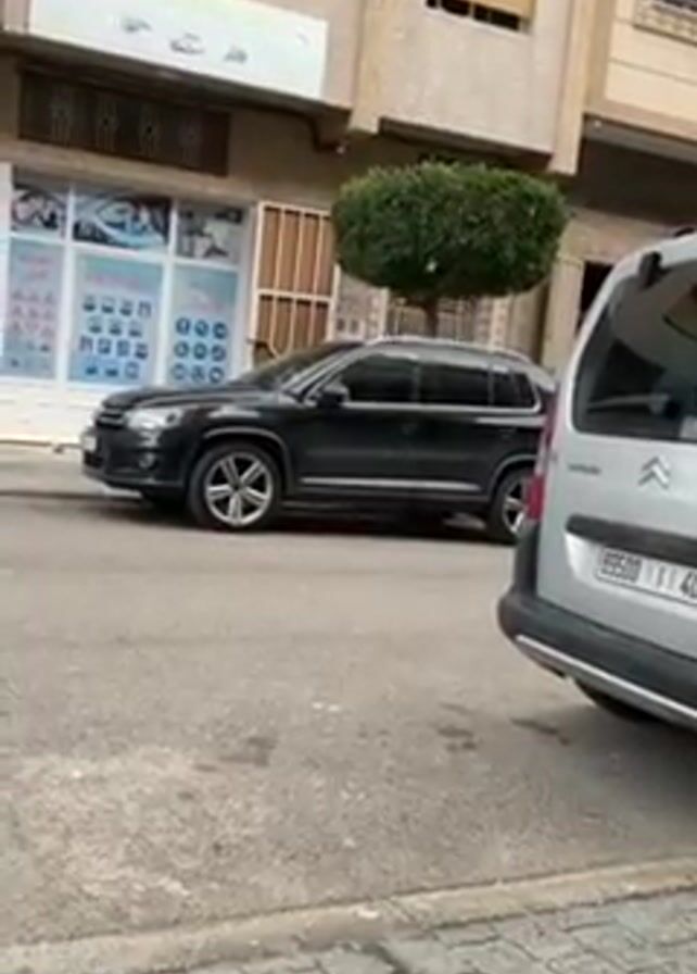 view from a low vantage point on a street. The bottom of a person's legs and shoes are visible in the foreground. Several cars are parked along the street. These include a black SUV, a silver van, and a white van. The buildings along the street are mostly two-story structures with neutral-colored facades. A shop with blue and white signage is visible in one building. A small, round tree is planted near the building. A lamppost and a stack of tires are also visible. The sky is overcast. The camera appears to be panning slowly to the left.