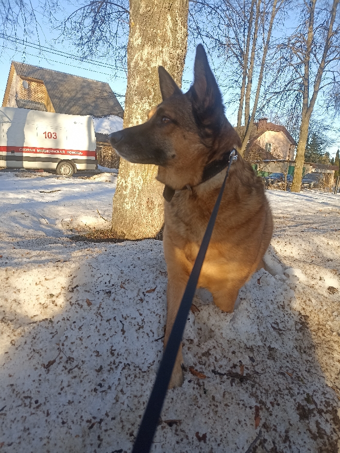 A tan-colored German Shepherd-type dog, wearing a dark collar with an attached black leash, stands on partially melted snow and dirt. The dog is positioned to the right of a large tree trunk, facing left with its attention directed out of frame. In the left background, a white ambulance van with red text "103" and "СКОРАЯ МЕДИЦИНСКАЯ ПОМОЩЬ" (Emergency Medical Aid) is parked. Behind the van, a light-colored building with a dark, pitched roof is visible. The right background features bare deciduous trees against a clear blue sky, with a second light-colored residential building also possessing a pitched roof. This scene is situated within a residential area of Minsk, Belarus, under clear, sunny weather conditions.