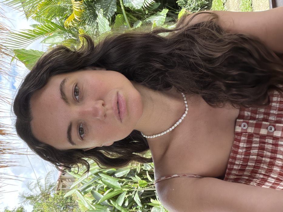 A young woman with long, wavy dark hair and a pearl necklace poses for a selfie. She is wearing a red and white checkered top. The background features lush greenery including palm trees and other tropical plants. The sky is visible in the upper left corner, suggesting an outdoor setting. The lighting appears to be natural daylight.