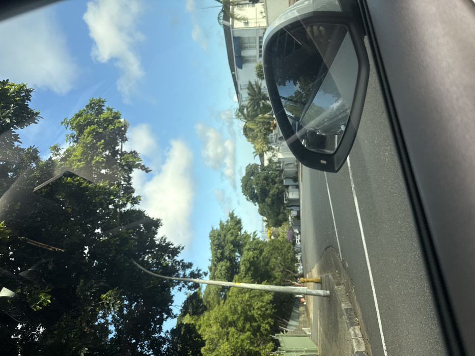 The image depicts a street scene in Durban, South Africa, observed from inside a vehicle through the front passenger window. The dark grey dashboard and the silver-framed passenger side mirror are prominent in the foreground. The sky is largely blue with scattered white cumulus clouds, partially obscured by the dense green canopy of overhead trees. The asphalt road in the mid-ground features a solid white line next to a dashed white line. To the left, a concrete sidewalk with a grey curb is visible. A grey lamppost stands on the sidewalk, with a yellow fire hydrant at its base. Behind the sidewalk, a dark green fence or wall separates the street from a property, which is heavily treed with various green foliage, including some trees displaying purple blossoms further down the street. Faint, indistinct figures appear to be on the sidewalk near the fence in the distance. On the right side, beyond the road and partially reflected in the side mirror, are large, multi-story residential buildings with white facades and dark roofs, some featuring blue awnings. Palm trees are interspersed among other trees in this area. A hazy, indistinct urban skyline or structures are visible on the distant horizon, consistent with a residential area in Durban, South Africa, offering a view towards the city center, potentially from an elevated neighborhood such as Morningside or Berea. No clear human figures or specific actions are discernible. The scene appears quiet and still.