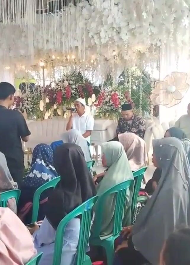 A mostly still shot shows a group of people seated in teal plastic chairs. Most of the seated people appear to be women, wearing hijabs in various colors and patterns. Facing them is a man in a white cap and white shirt speaking into a microphone. Behind him and to his side is a man in a patterned shirt and a black cap. The background is decorated with white draping and floral arrangements. A man in a black shirt stands to the left, seemingly operating a camera. The lighting is bright, and the scene appears to be taking place indoors.