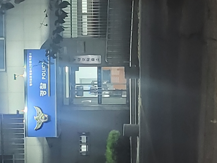 The image depicts the illuminated exterior of a police station at night, located in Gimpo-si, South Korea