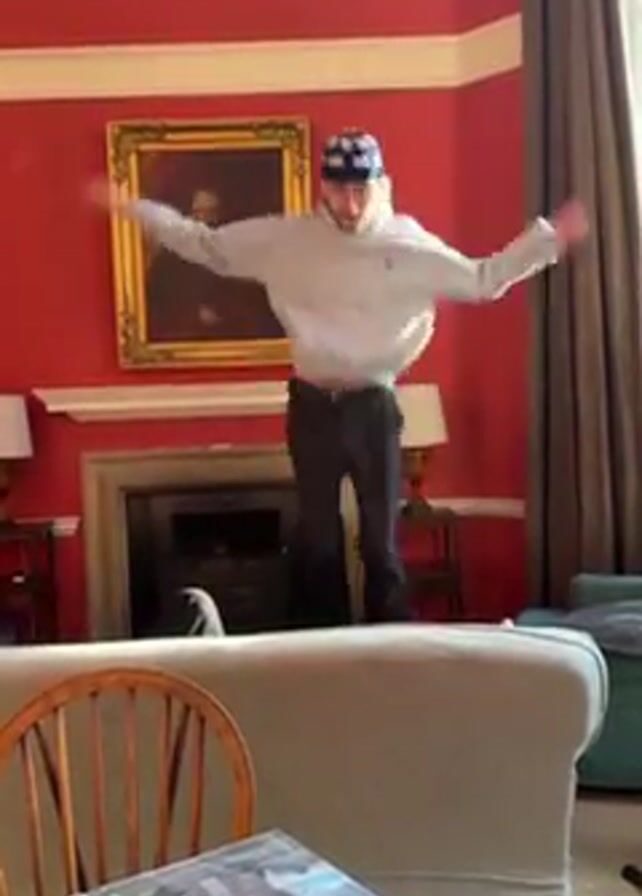 man in a living room. He is wearing a gray hoodie, dark pants, and a hat with a blue and white pattern. He jumps onto the back of a gray couch and then immediately says "Oh my God, they're wicked," before then struggling to climb off the back of the couch. The room is decorated in shades of red. There is a painting hanging above the fireplace, as well as a table with a book and a pen on it. The camera is static and focused on the man and the couch.