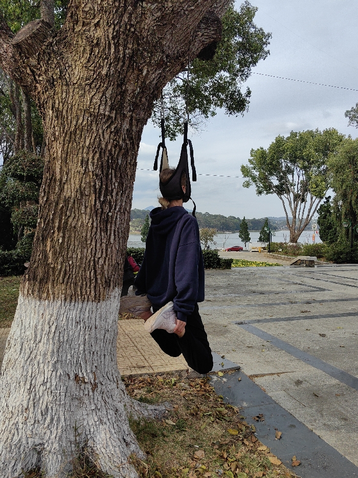 An individual is depicted from the back, suspended by a black head harness from a branch of a large, rough-barked tree located in a public park area next to Xuan Huong Lake in Da Lat, Vietnam. The lower trunk of the tree is painted white. The person wears a dark blue hooded sweatshirt and dark pants, with light-colored sneakers on their feet. Their knees are bent, and their right hand grasps their right ankle. The ground around the tree consists of dry leaves and grass, transitioning to a light-colored, patterned walkway. In the mid-ground, Xuan Huong Lake extends horizontally, with tree-lined shores visible beyond. A red vehicle is partially visible parked near the lake's edge in the distance. The sky is overcast.