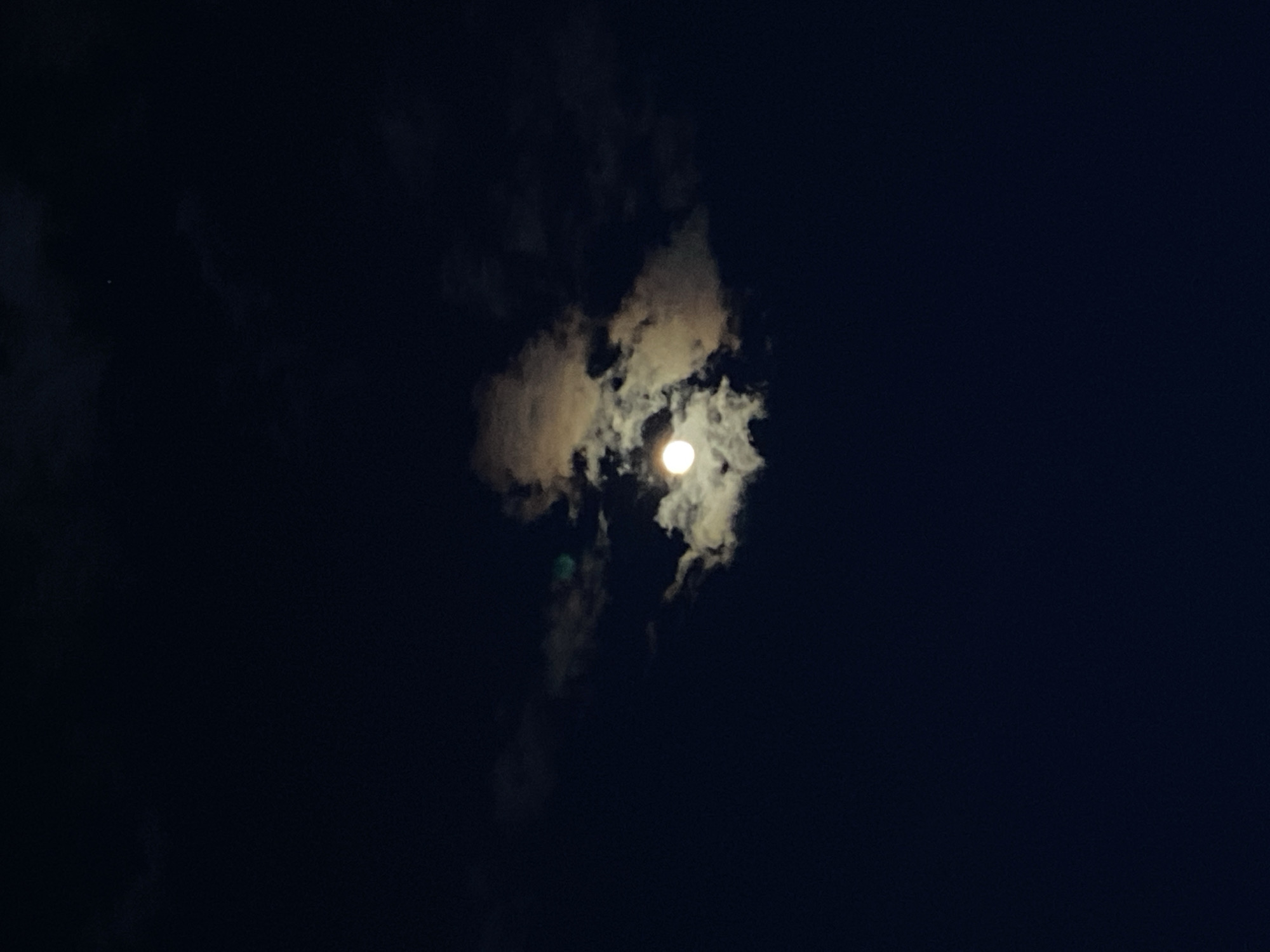 A dark, night scene shows the moon partially obscured by clouds
