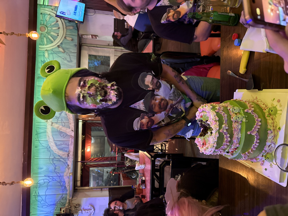 The image depicts an indoor scene within a bar or restaurant in Mexico City, Mexico. A male individual with dark hair and a beard, wearing a green frog hat and a black t-shirt displaying multiple printed male faces, stands facing the camera. His face is heavily covered in green, pink, and white cake frosting mixed with cake crumbs. His arms are crossed at his waist. Directly in front of him on a wooden table, a two-tiered cake, predominantly green with pink and white frosting and small green frog-shaped decorations, is significantly consumed, with a large portion missing from the top tier. To the right, another male subject wearing an identical t-shirt is partially visible. Additional patrons are seated at tables in the background. The establishment's walls feature nautical-themed decorations, including a blue crab mural, a ship's wheel, and an anchor, under warm, exposed-bulb lighting. A television screen on the right wall displays the text 'A MI MANERA'. A partial view of an exterior street or alley is visible through a doorway in the background. A person's hand holding a smartphone is visible in the lower right foreground.