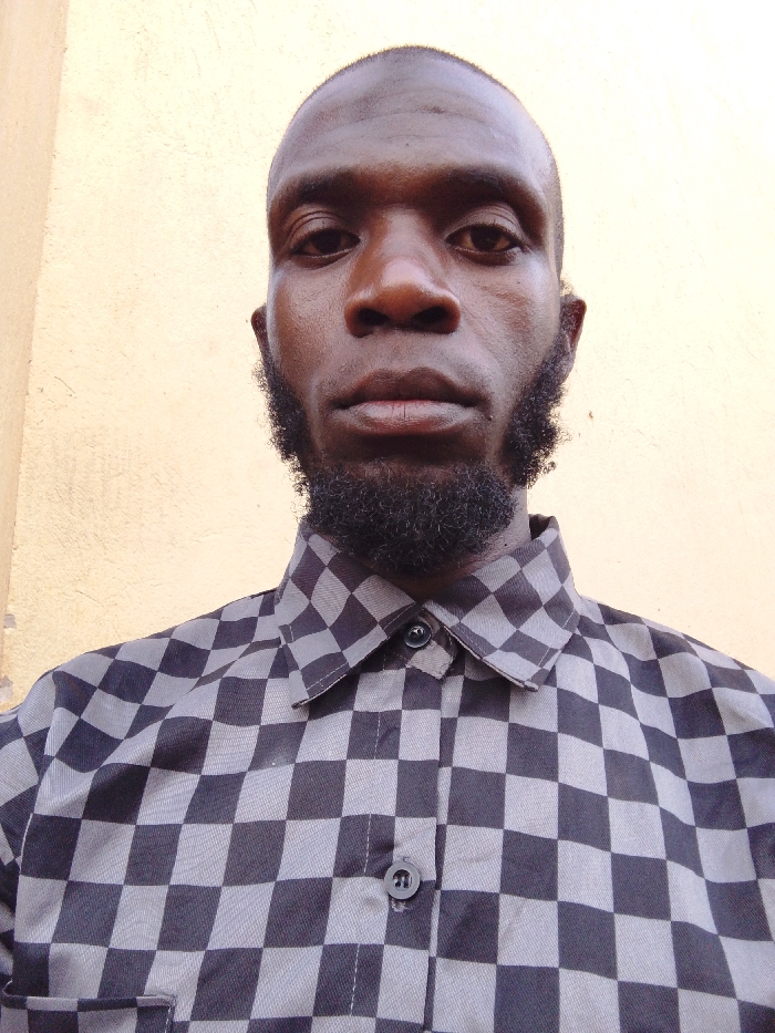 A close-up, chest-up image captures an adult male against a plain, light yellowish-beige wall. The scene is identified as being in the city of Bujuko, Uganda. The male subject has dark skin, a shaved head, and a short, dark beard and mustache. He is wearing a collared shirt with a black and light grey checkerboard pattern; the top two visible buttons are fastened. A pocket is discernible on the left side of his chest. He maintains a direct, neutral gaze towards the camera. The background wall exhibits a slightly rough texture. Lighting appears even, without prominent shadows.