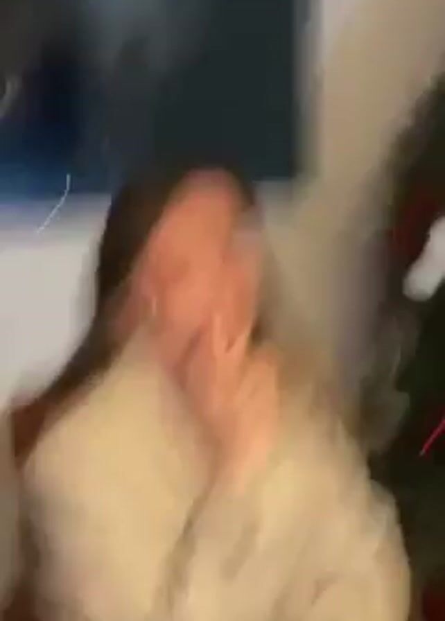 A woman is sitting at a table next to a Christmas tree and in front of a window. She's wearing a light tan overcoat. She puts her fingers in her mouth, makes gagging noises, and holds a cigarette.