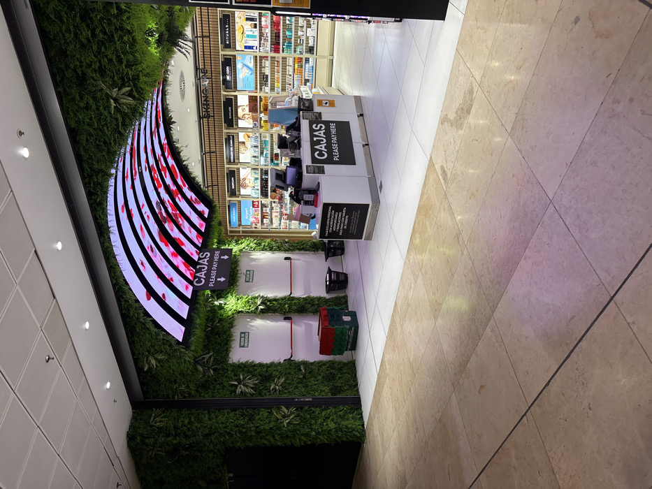 An eye-level shot of a shopping center captures the checkout area for the "Rituals" brand. The checkout counter is marked by a black sign reading "CAJAS PLEASE PAY HERE". The counter's backdrop is an LED screen display covered in flora. Three walls with fake greenery have emergency exit doors. Baskets are stacked below. A marble-tiled floor extends to the right and back of the frame, complementing the modern architectural design.