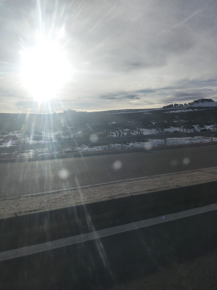 This image depicts a snow-covered winter landscape in Ifrane, Morocco, under a bright, partly cloudy sky. The sun, positioned in the upper left quadrant, causes significant lens flare, creating radial light streaks and circular artifacts across the scene. In the foreground, an asphalt road occupies the lower third of the image, featuring a white lane marker near the bottom edge and a light grey concrete curb separating it from the lower right. No vehicles or pedestrians are present. The mid-ground reveals a metal guardrail running parallel to the road, beyond which lies snow-covered terrain interspersed with dark green vegetation. A black-and-white chevron sign, indicating a curve to the right, is visible behind the guardrail on the right side. The background consists of rolling hills or mountains, partially blanketed in snow and dense, dark vegetation. A substantial, multi-tiered building with a distinct roofline is silhouetted against the bright sky on a distant rise to the left of center. The sky above is a mix of bright overcast conditions and linear cloud formations. No actions or interactions are depicted; the scene is static.