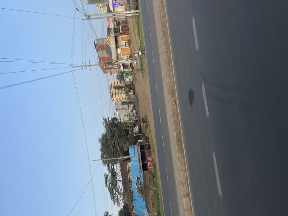 The image depicts a daytime scene in Biashara ward, Kenya, under a clear blue sky. In the foreground, a multi-lane asphalt road with a concrete median strip is visible, extending horizontally across the lower third of the frame. White dashed lane markings are present on both sides of the median. The midground features a wide dirt shoulder adjacent to the road, with sparse green vegetation. On the left, a long blue corrugated metal fence encloses an area, behind which trees and the roof of a light-colored building are visible. In front of this fence, a small, rustic wooden stall with a red roof and white text (partially legible as "Airtel") stands close to the dirt shoulder. Towards the center and right midground, a dirt path diverges from the main road, leading into an area with several buildings of varying construction. Some structures appear to be single-story commercial stalls, one prominently displaying "HARDWARE" in white letters on a dark fascia. Further back, multi-story residential or commercial buildings, including one light-grey and one yellow/orange structure, rise above the surrounding terrain. Overhead, a network of utility poles and numerous power lines spans the sky. A single individual, dressed in light-colored clothing with a red accent, is walking from left to right on the dirt shoulder near the "HARDWARE" building, facing away from the camera. No other people, vehicles, or significant interactions are visible. The overall environment suggests a developing urban or semi-urban area with mixed commercial and residential elements.
