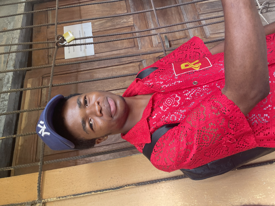 This image captures a young adult male in Ihiagwa, Nigeria, positioned directly facing the camera. He has a dark complexion, short dark hair, and minimal facial hair, with a small stud earring visible in his left ear. He is wearing a navy blue baseball cap with a white "NY" logo prominently displayed on the front. His attire consists of a short-sleeved, collared red shirt made of a lace-like patterned fabric, with black backpack straps visible over his shoulders. A yellow and white "R" emblem is present on the left chest area of his shirt. The subject is standing in front of a dark brown wooden door, which is secured by a dark, possibly rusted, metal security gate composed of vertical and horizontal bars. A yellow padlock is attached to the metal gate on the right side. A white paper notice is affixed to the security bars and the wooden door to the right of the padlock. The notice displays partially legible text, including "MISS. ONY...", "Department of Sociology", "2023/2024 Session Advisor", and phone numbers. To the immediate left of the subject, a light brown/tan wall is visible. The scene is illuminated by natural daylight.