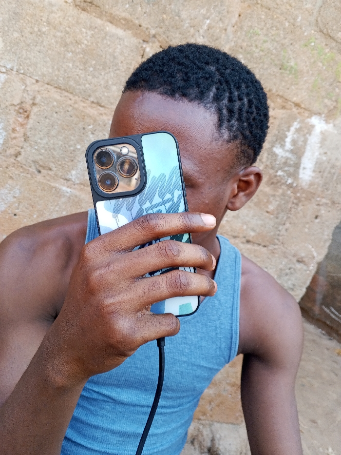 An individual with dark skin, wearing a light blue ribbed tank top, is depicted in Akwanga, Nigeria. The person is holding a smartphone vertically with their right hand, obscuring the lower half of their face. The phone, which appears to be an iPhone with a prominent triple-lens camera module, is encased in a multi-colored protective cover featuring a blue, white, and black abstract pattern. A black cable is connected to the phone's charging port and extends downwards. The individual's short, dark, wavy hair and right ear are visible. The background consists of a textured, light brown or tan wall.