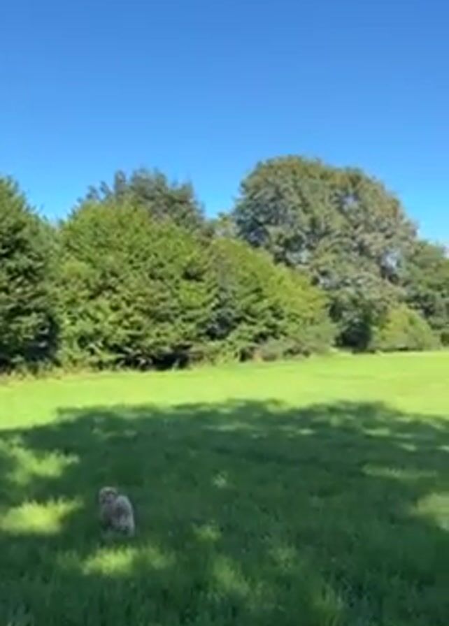 sunny day with a clear blue sky above a green meadow. A small, fluffy dog is standing in the grass in the foreground. Trees line the edges of the meadow. The camera pans slightly to the right, revealing more of the meadow and the line of trees in the distance.