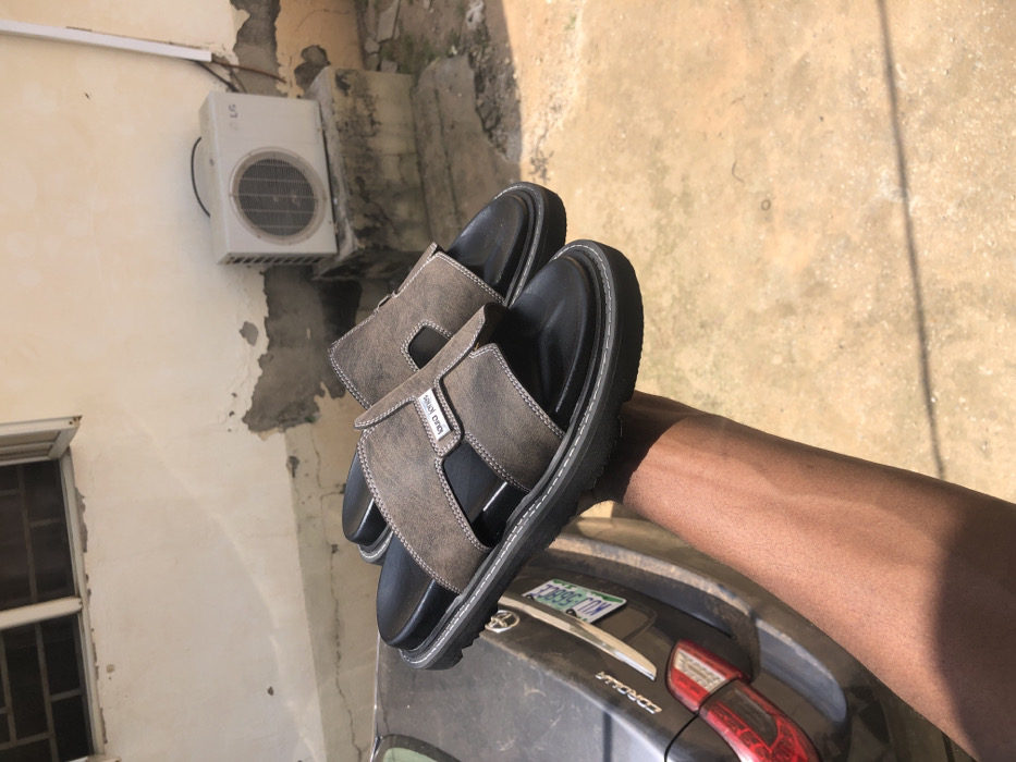 - "The image displays a pair of dark brownish-grey and black men's slide sandals, branded "Lousa Jones," held by a person's right arm" by FM-lnZkz2, licensed under CC BY 4.0