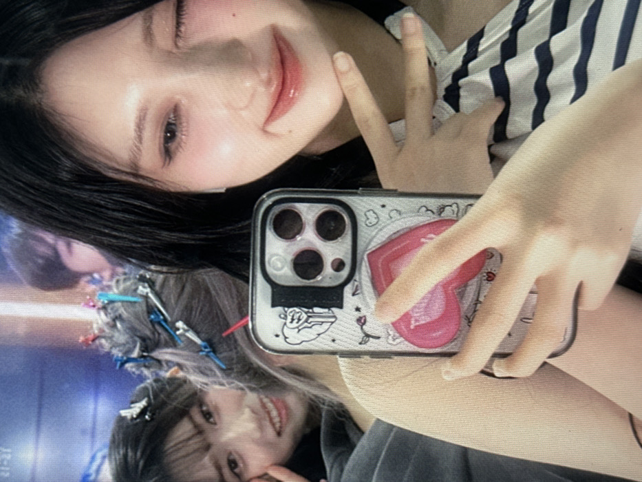 The image displays three East Asian females in an indoor, professionally lit environment, likely a backstage area or studio. In the foreground, a female with long black hair, prominent makeup (pink blush, lip gloss), and a white wireless earbud winks at the camera while holding a silver-colored iPhone, identifiable by its triple-lens camera module, in a clear case adorned with a large pink heart, a red rose, and subtle cartoon outlines. She makes a "peace" sign with her left hand and wears a white and navy striped halter-neck top. To her left, a second female with dark hair, styled with silver hair clips, smiles towards the camera with her left hand near her cheek. Between these two, a third person's head is visible from behind, featuring hair styled with multiple colorful hair clips (blue, red, silver). The background is blurred with warm ambient lighting. This setting is consistent with a performance preparation area or broadcasting studio, common in entertainment industry hubs within Seoul, South Korea, such as districts like Gangnam, Mapo, or Yeouido.