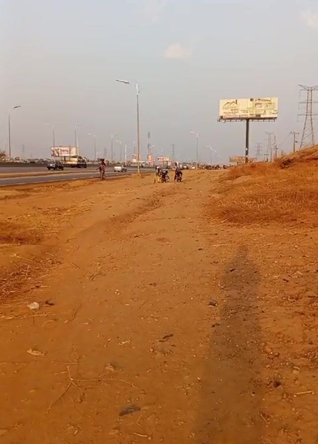 dirt road running parallel to a busy highway. There are several people walking and riding motorcycles on the dirt road. The highway has multiple lanes of traffic and is lined with streetlights and billboards. Power lines run along the side of the road. The sky is light blue and hazy. The dirt road is reddish-brown and covered with dry grass and debris. The overall impression is of a roadside scene in a developing country.