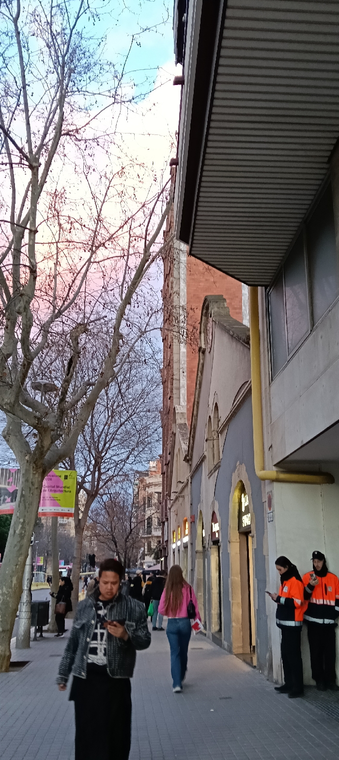 A street scene shows pedestrians on a sidewalk, including a person in a patterned jacket looking at a phone and another in pink. Two workers in orange jackets stand near a building. Bare trees line the street with a pink and blue sky visible above. The architecture features various building styles, including arched windows and a modern overhanging structure. A yellow pipe runs along the side of one building.