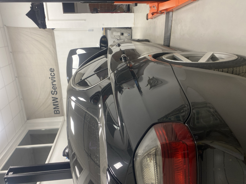 The image depicts the interior of a BMW automotive service facility in Unknown, Unknown. A black four-door BMW sedan, viewed from its rear-left quarter, occupies the foreground and midground. The vehicle's hood is open, suggesting ongoing maintenance or inspection. A visible layer of dust covers the rear windshield and trunk lid. The car is fitted with aftermarket multi-spoke silver alloy wheels. The facility features light-colored walls, with a beige banner displaying "BMW Service" in dark text affixed to the back wall. Overhead, recessed rectangular lighting fixtures provide illumination. An orange and black two-post vehicle lift is situated on the right side of the frame. High on the left wall, multiple rectangular windows are visible. Metallic components, possibly engine parts, are vaguely discernible against a far wall to the right. No individuals are present in the scene.
