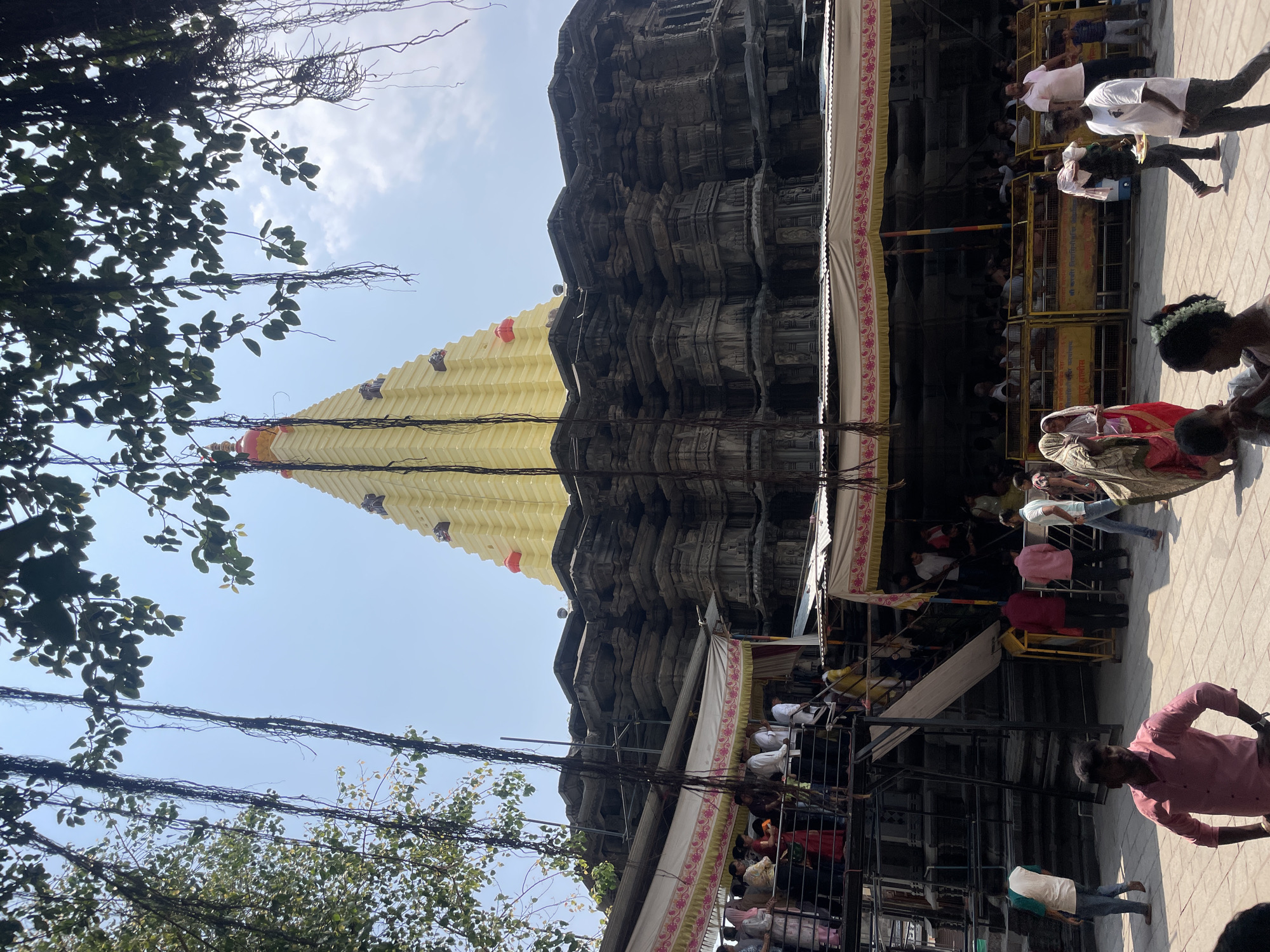 The image displays the Mahalaxmi Temple (Ambabai Temple) in Kolhapur, Maharashtra, India, viewed from a low angle. The temple's lower structure consists of dark grey, intricately carved stone tiers. Above this, a prominent, multi-tiered, light yellow pyramidal spire (shikhara) rises, adorned with small reddish-orange elements and topped by a red finial. Metal scaffolding is visible against the stone facade on the left side of the temple, indicating ongoing work. In the mid-ground, a large number of individuals are present. Many people are seen on elevated black metal walkways and stairs, covered by white and yellow striped fabric awnings, forming queues towards the temple's entrance. On the paved ground level below, several people are walking, standing, and interacting. Clothing varies from traditional Indian attire, such as sarees and kurtas, to modern casual wear. Yellow metal crowd control barriers are positioned horizontally on the ground level, separating pedestrian areas. Dense green tree foliage with numerous dark, thick aerial roots hangs into the upper portion of the frame, partially obscuring the clear, bright blue sky. The scene is illuminated by direct sunlight.