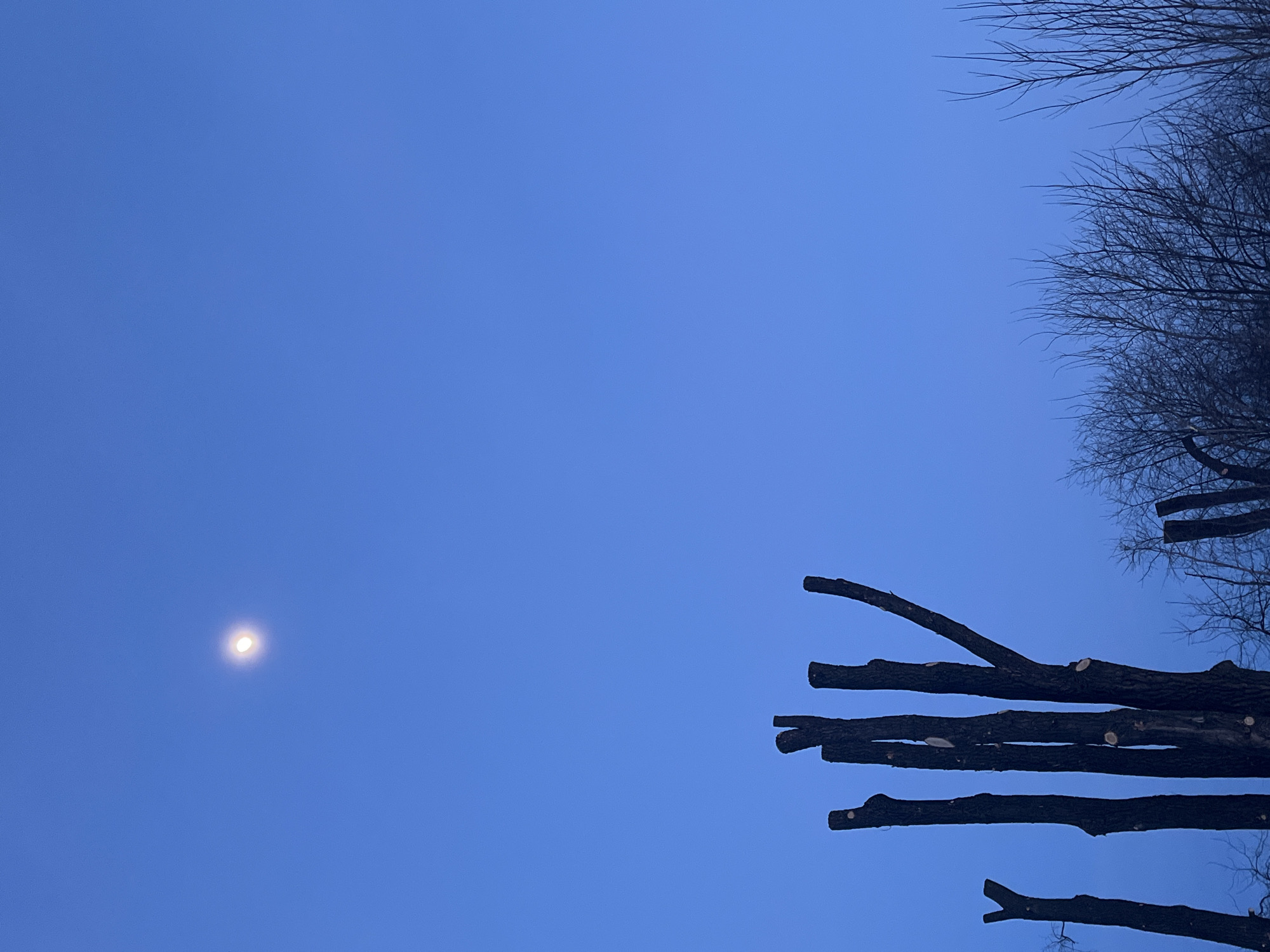 The scene depicts an outdoor environment in Kuyeda, Russia, observed during twilight. The upper two-thirds of the image are dominated by a deep, uniform blue sky. A bright, ovoid celestial body, consistent with the moon, is visible in the upper left quadrant. The lower third of the image features the upper sections of multiple heavily pruned deciduous trees. These trees present as dark, vertical trunks and stubs, exhibiting evidence of recent cuts with lighter wood visible on their truncated surfaces. To the right, a cluster of unpruned deciduous trees with dense, bare branches extends into the frame. No human subjects, animals, artificial structures, or discernible activity are present within the captured scene.