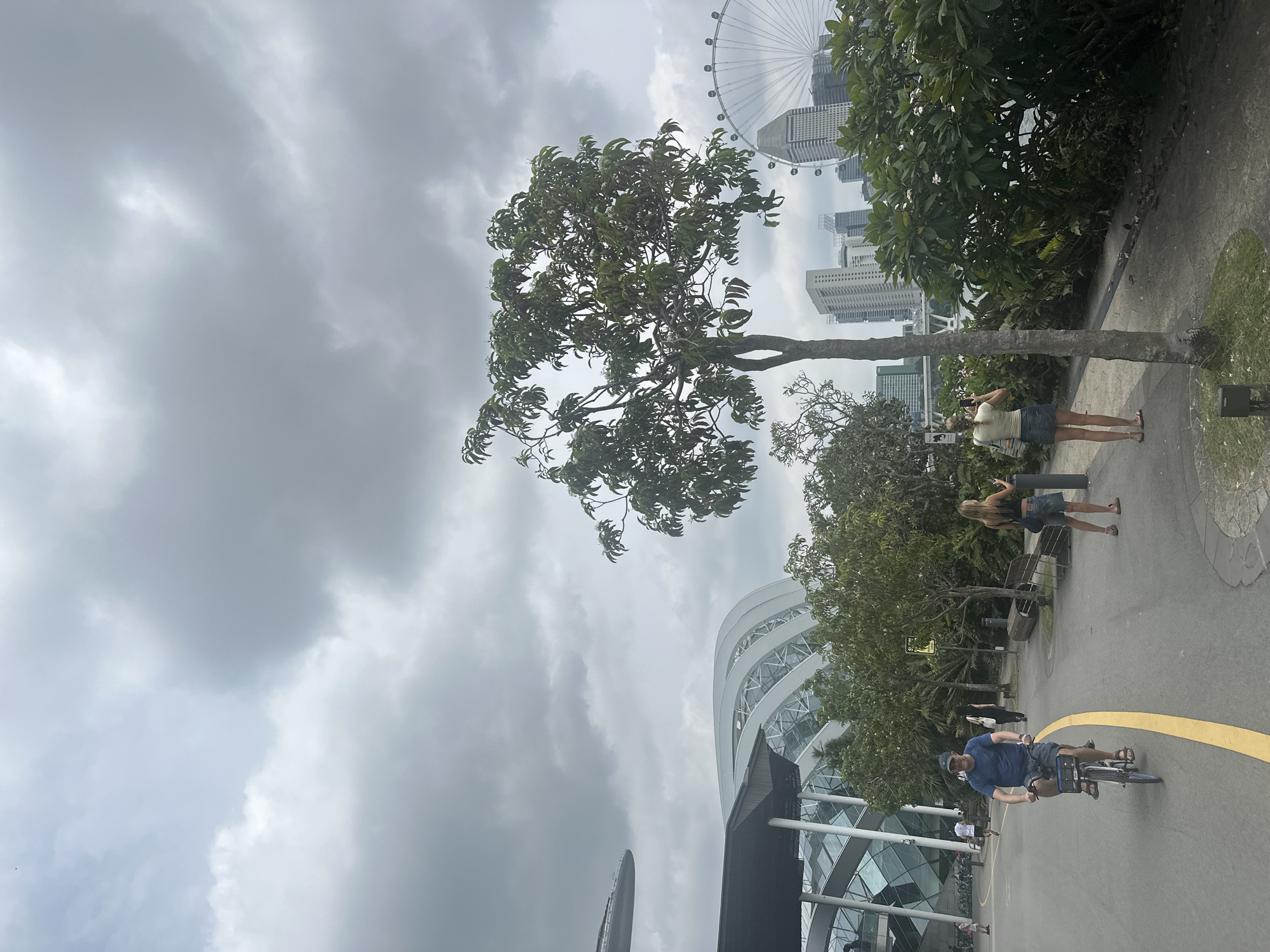An outdoor photograph depicts a paved pathway and urban landscape within Gardens by the Bay, Singapore, under a heavily overcast sky