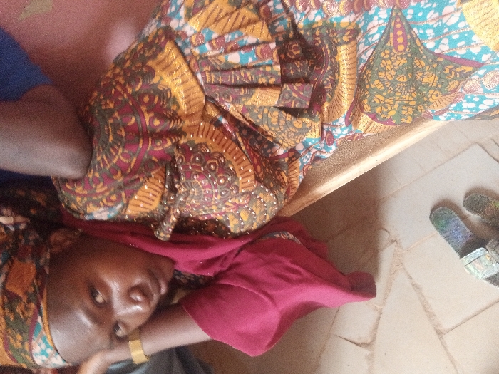 The image displays an indoor scene. A dark-skinned individual, likely female, is partially depicted reclining or lying down in the foreground. She wears a patterned headwrap with green, yellow, and black hues, a red garment over her shoulders, and a golden-colored bracelet on her left wrist. Her eyes are open, directed towards the viewer. A second arm, clothed in a blue sleeve, is partially visible on the left side of the frame. A brightly patterned fabric, featuring intricate designs in yellow, orange, maroon, blue, green, and gold glitter, covers a surface, consistent with a bed or bench, positioned horizontally across the mid-right of the image. The floor consists of light-colored square tiles with visible grout lines and some surface debris. Two light-colored, open-toed sandals are present on the tiled floor in the lower right quadrant. The specific location within Akwanga, Nigeria, is not discernible from the visual content provided.