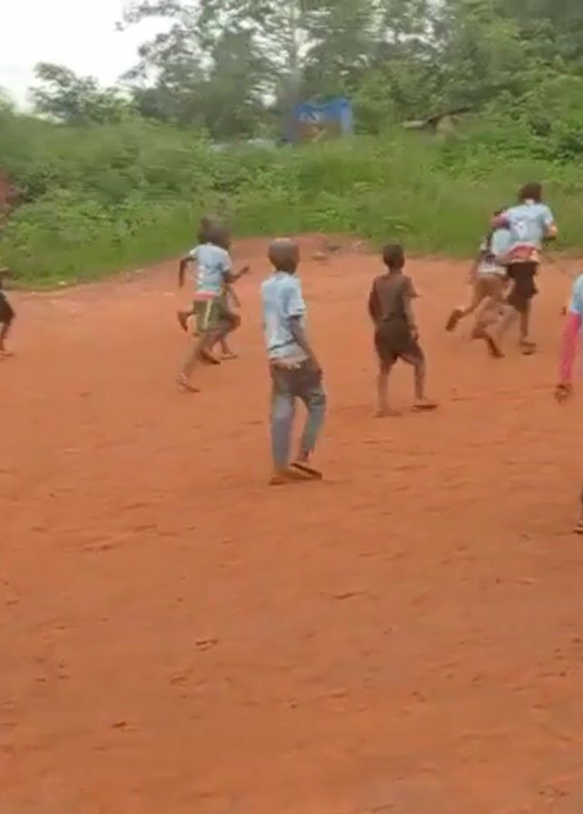 A group of approximately 15 children play soccer on a dirt field. The children wear various clothing items, including t-shirts, shorts, jeans, and sandals. Some wear yellow jerseys with numbers on them. The soccer ball is brown and white. The field is surrounded by green foliage and some scattered buildings. A group of adults are standing near the edge of the field, observing the game. The camera moves, following the action on the field. The overall tone of the scene is playful and energetic.