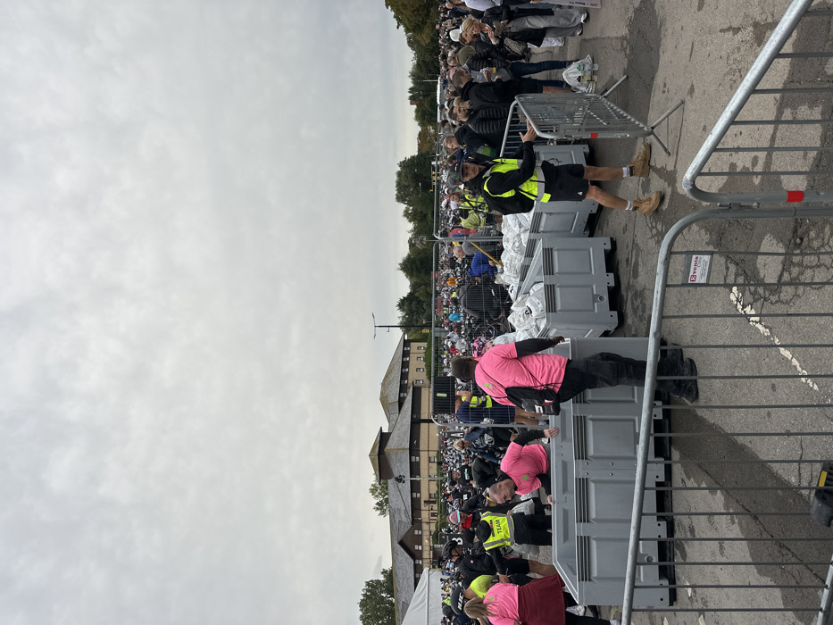 The image depicts an outdoor event scene located in a paved area adjacent to the Weymouth College campus in Weymouth, United Kingdom. The Weymouth College buildings, characterized by their multi-story structure, dark gabled roofs, and light-colored stone or brick facades, are visible in the mid-background beneath an overcast, grey sky. In the foreground and mid-ground, a large gathering of individuals is observed. Numerous bicycles are racked in dense rows, suggesting a transition area for a cycling event or triathlon. Several grey, rectangular plastic containers are prominent, with multiple units visible in a row on the right and at least one on the left. These containers hold numerous white, uniformly sized bags, likely participant gear. Multiple individuals are actively engaged: - A man wearing a bright pink t-shirt is leaning into one of the grey containers on the left, appearing to interact with its contents. - Another man in a bright pink t-shirt with a black backpack is standing with his back to the camera, next to the containers on the right. - A man in a yellow high-visibility vest labeled "TEAM" is visible on the far left. - A man in a yellow high-visibility vest and tan boots is standing on the right, holding onto a metal crowd control barrier. - Other individuals in the crowd are wearing a mix of casual attire and athletic wear, with some sporting bib numbers. Metal crowd control barriers, some branded "e.g. Events," delineate sections of the paved area in the immediate foreground and mid-ground. The ground is a dark, paved surface, likely asphalt, with some faint white markings. Trees and other vegetation are visible behind the college buildings.