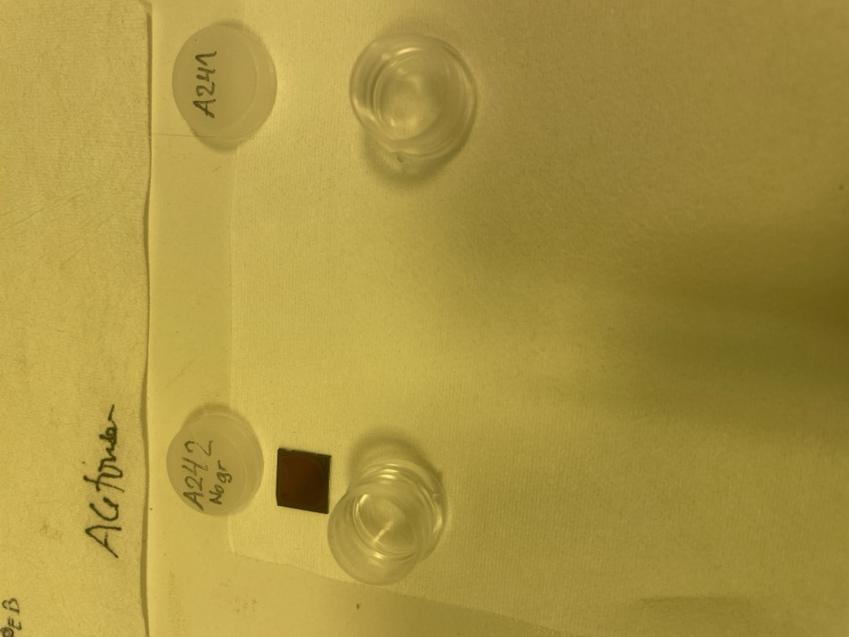 The image displays a static scene within a laboratory or cleanroom environment, likely located in San Carlos de Bariloche, Argentina. The entire scene is bathed in a distinct yellow light, typical of photolithography or semiconductor processing areas. The primary surface is covered with a light yellow, fibrous material, possibly a cleanroom wipe or mat. In the upper central portion, handwritten in black ink, the word "Acetona" (Acetone) is visible. Below this, slightly to the left, rests a translucent white plastic cap with "A242" and "No gr" handwritten on its top. Adjacent to and slightly below this cap is a small, square, dark reddish-brown solid sample. Below this sample and cap, a clear, translucent plastic container, resembling the bottom part of a small petri dish or a sample holder, is positioned. To the right, another identical translucent white plastic cap bears the handwritten inscription "A241". Below this cap, another clear, translucent plastic container, mirroring the one on the left, is situated. No individuals are present in the frame, and no actions are currently underway. The arrangement suggests an organized workspace for handling and identifying samples or materials.