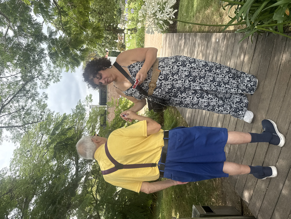 Two individuals are engaged in an exchange on a wooden plank pathway within a garden setting, identified as likely within Prado Park, Montevideo, Uruguay