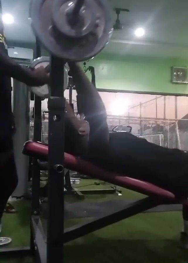 man lying on a weight bench, lifting a barbell with weights. He's wearing a black shirt. Another man stands nearby, seemingly spotting or observing. The setting appears to be a gym, indicated by the weight bench, exercise equipment in the background, and a green floor covering that resembles artificial turf. There are mirrors and a window visible along the walls. The lighting in the gym is somewhat dim. The man on the bench lifts the barbell from a rack, lowers it to his chest, and then pushes it back up.