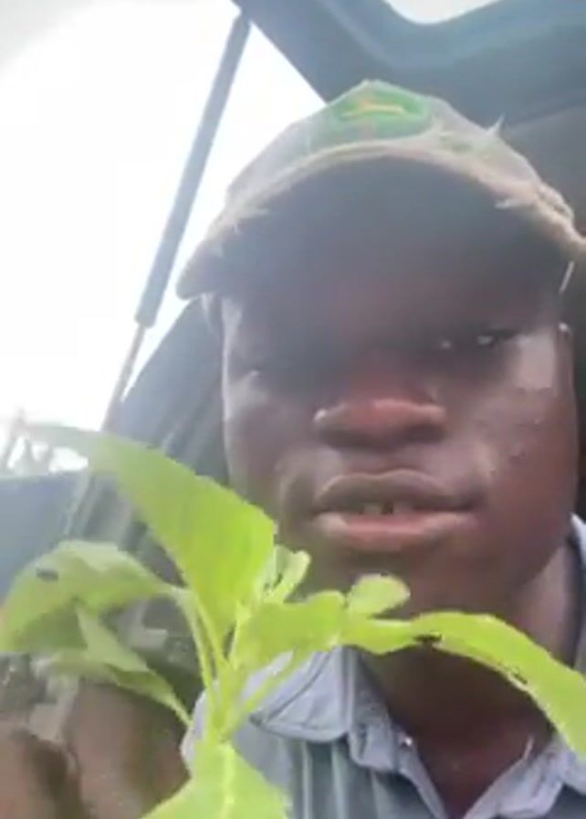 Inside the cabin of a vehicle, a man wearing a tan John Deere cap and a light blue button-up shirt holds up a green leafy plant. He is looking directly into the camera. The plant has several leaves, some of which have holes. The man is talking, and he points at the plant as he speaks. The light outside the vehicle is bright.