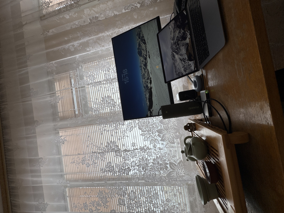 The scene depicts an indoor workstation setup situated in Hrodna, Belarus, positioned in front of a window. A light-brown, possibly wooden, desk occupies the lower two-thirds of the image. On the desk, a black monitor is prominently displayed, showing a snowy mountain range as its wallpaper. The monitor's upper-left corner displays "Ср 17 Апр" and "15:18", indicating Wednesday, April 17th, at 3:18 PM. To the right of the monitor, a silver MacBook laptop is open, its screen mirroring a similar snowy mountain wallpaper. To the left of the monitor, a light-brown, slatted wooden tea tray is arranged. On this tray rests a light-green ceramic teapot and a small, dark-red ceramic bowl containing liquid. Two light-green ceramic bowls are stacked nearby. A small, brown figurine, resembling a seated figure, is positioned behind the teapot on the tray. Between the tea tray and the monitor, a dark gray vertical electronic device labeled "HUAWEI" stands. To its right, a smaller black device with a lens, likely a webcam, is visible. A silver USB-C hub with an illuminated green indicator light is connected by multiple black cables that are spread across the desk surface, linking various devices. A light-colored, circular ring-shaped object is also present on the desk to the right of the hub. The background consists of two windows covered by light-colored horizontal blinds, which are partially obscured by transparent white lace curtains featuring a floral pattern. Natural light filters through the blinds and curtains from outside. No individuals are present in the image.