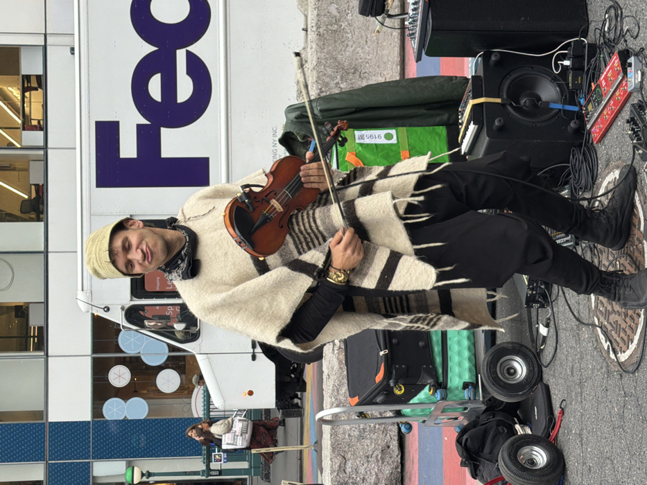 An outdoor scene in New York City, United States, features a male street performer standing on a paved urban surface with colorful sections and a metal manhole cover. Behind him is a white FedEx delivery truck, displaying "EXPRESS SHIPPING NEW YORK, NY". A modern glass building with a blue patterned facade and a green lamppost are visible in the background left. The performer, a male with light skin and a playful, puckered facial expression, is dressed in a light tan beanie, a black bandana, a cream and black striped poncho over a black long-sleeved shirt, black pants, and dark boots. A gold-toned bracelet adorns his left wrist. He holds a brown violin equipped with a black pickup in his left hand and a violin bow in his right. Surrounding him on the ground are various music performance components: a large black speaker/subwoofer topped with a small black synthesizer/keyboard, multiple electronic pedals (including a red one), a mixer/audio interface, and numerous black cables. To his left, a silver hand truck transports a black suitcase and a teal-green patterned suitcase. Loose wheels and a black bag are also on the ground. A green utility bag with a white label ("91956") and a dark green jacket rest against a grey concrete barrier. Two blurred female figures walk in the distant background left.