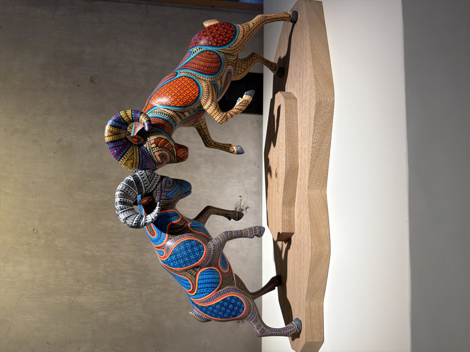 Two brightly painted wooden ram sculptures are mounted on a neutral wood panel affixed to a wall