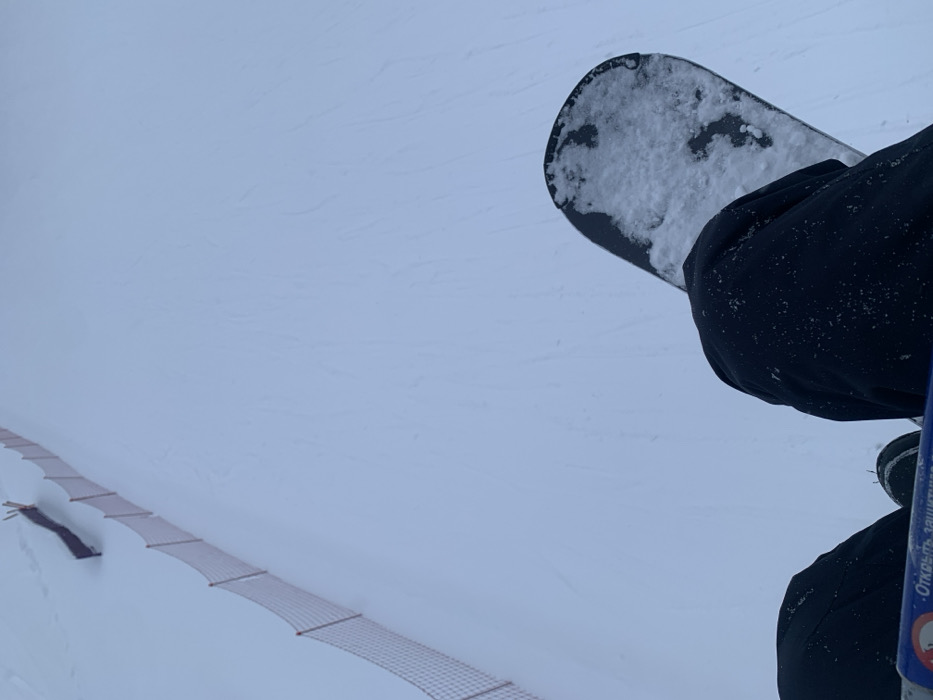 The image depicts a first-person perspective from a seated individual on a ski lift at a snow-covered resort in Unknown, Russia. The lower legs and knees of a person, clad in black, snow-dusted winter pants, are visible at the bottom. To the immediate right, a black snowboard, partially covered in snow, is present, angled downwards and right. A blue metal bar, likely part of the ski lift's safety mechanism, runs horizontally across the bottom, displaying partially legible white Russian text including "Открыт" and "защитительная". The majority of the frame features a wide, gently sloping, snow-covered piste exhibiting subtle textures and faint tracks. Along the left edge of the slope, an orange mesh safety fence, supported by wooden posts, extends diagonally upwards into the distance. A darker, unidentified object is visible further up the slope behind this fence. The scene is illuminated by diffuse, overcast light, characteristic of a winter day.