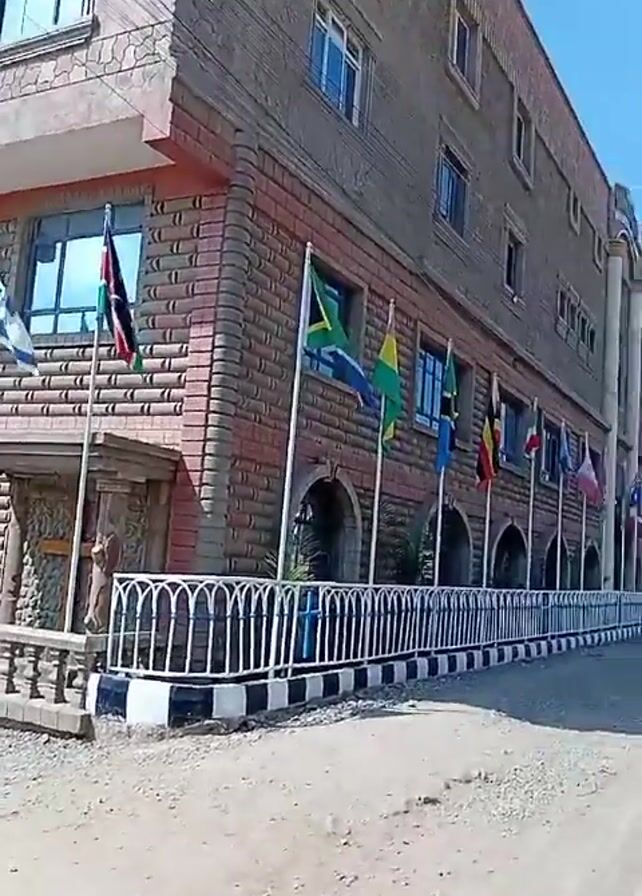 low-angle shot of a building with several flags lined up in front of it, on a dirt road. The building is multi-story and constructed with what appears to be a combination of brick and concrete, and the flags are arranged behind a white and black striped railing. The flags include those of Nigeria, Israel, Kenya, South Africa, Tanzania, and Uganda, among others. A man walks away from the camera down the road in front of the building. The sky is clear.